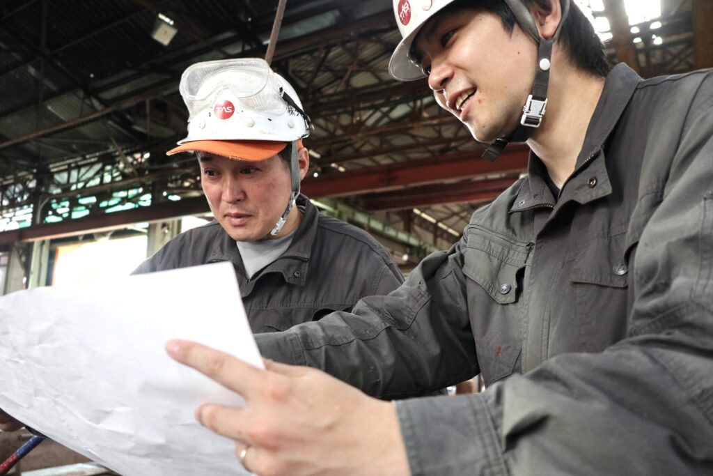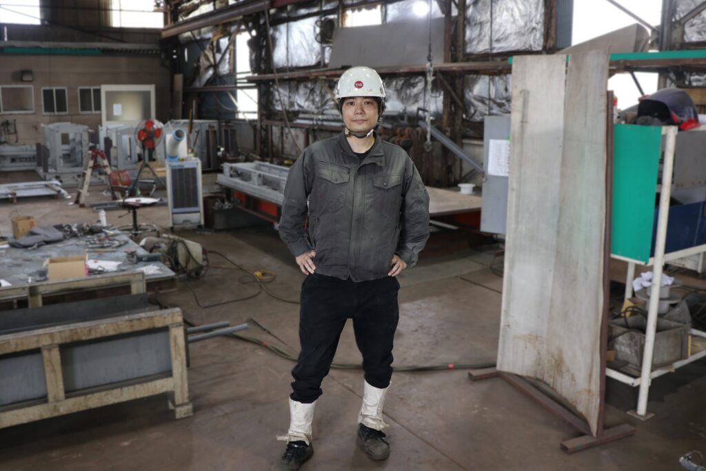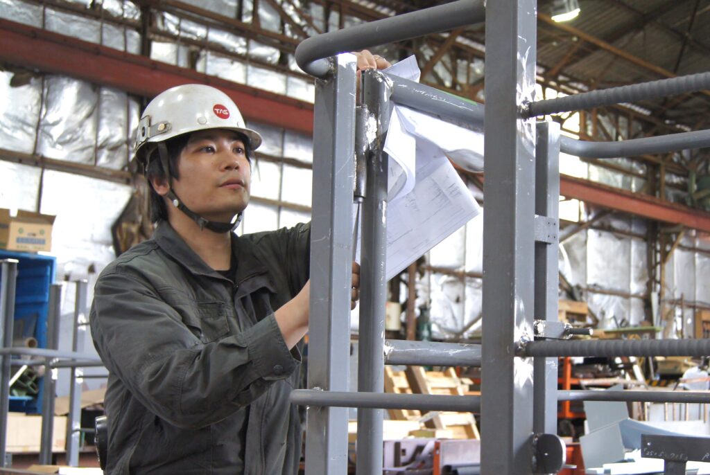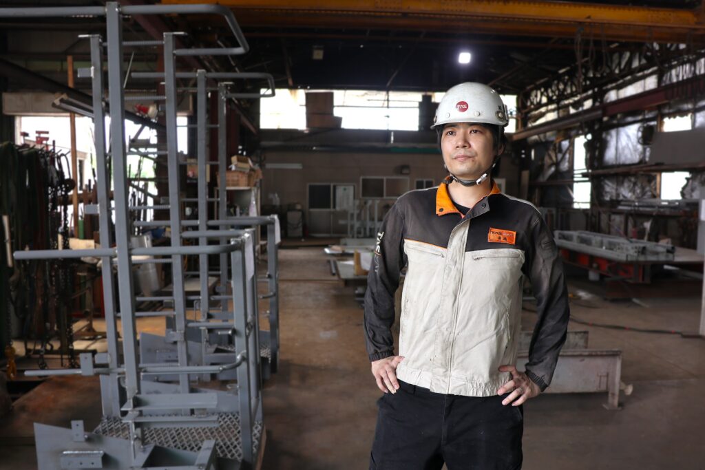 荷役運搬設備の運転室等を製造している㈱タステム.で働く渡部さんは、運転室の溶接や組み立てを担当している。元々ものづくりに関心があり高専を卒業後、他社で働いていたが、溶接の仕事ができるタステム.に転職した。