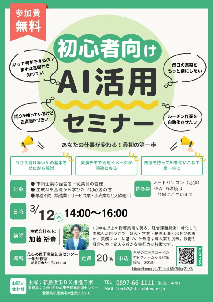 開催日:3月12日(木) 14:00~16:00 場 所:えひめ東予産業創造センター 一般研修室 愛媛県新居浜市大生院2151-10 対象者:市内企業の経営者・従業員の皆さま 生成AIを基礎から学びたい初心者の方 業種不問(製造業・サービス業・小売りなど大歓迎!) 参加費:無料 持参物:ノートパソコン(必須) 会場にFi-Wi環境はございます。 PC貸出や設定支援が必要な方は申込時にお知らせください。