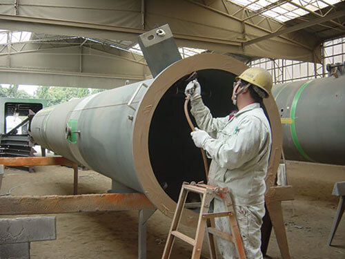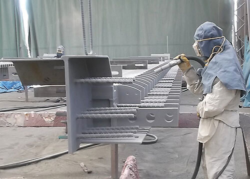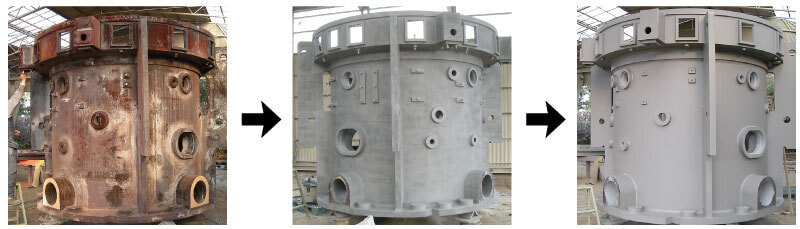 塗装の際には、表面を凹凸にして塗料が付着しやすいように下地処理をする必要で、「下地処理を上手く行わないと、いくら高級な塗料でも剥がれてしまう」という。さまざまな処理方法があるが、同社では砂を鉄の表面に高速で吹き付けて凹凸を付ける「サンドブラスト」と呼ばれる技術を用いる。造船関連や橋梁などから指定される場合が多く、サンドブラスト専用工場の西条工場には、10トンクレーン1基と2.8トンクレーン2基を完備し、大型重量物に対応。移動式のテントハウスも4基備えており、天候に左右されず作業をすることができるなど、さまざまなニーズに対応できる体制を構築している。大量に発生する残砂の処理や大きなスペースが必要なため「中小企業で設備を持っているところは少ない」と胸を張る。また複雑な形状の部材に対応するため、作業は手作業で行われる。防護服を着て視界の狭い中での作業となるため、長年の経験と技術の見せどころとなる。